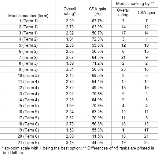 In order to address the first research question, the 21 modules were ranked according to mean global ratings or mean CSA gain values (aggregated from 15 specific learning objective gains). The second research question was addressed by calculating correlations between mean values of traditional evaluation items and aggregated CSA gain per module.