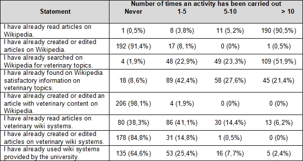 Results: Most respondents, especially students in the first years, had comprehensive experience in the use of Wikipedia and veterinary wiki systems. In contrast, the experience in writing or editing of information was low (8.6% Wikipedia, 15.3% veterinary wiki systems). Male students had significantly more writing experience than females (p=0,008). In addition, students of the higher years were more experienced in writing and editing than students of the first year (7.4% in the 4th year). The familiarity with wiki systems offered by universities was low. The majority of students (96.2%) are willing to use veterinary wiki systems as an information tool in the future. Nevertheless, only a low percentage is willing to write or edit content. Many students, however, expect a better learning success when writing own texts. In general, students consider the quality of information in a wiki system as correct.