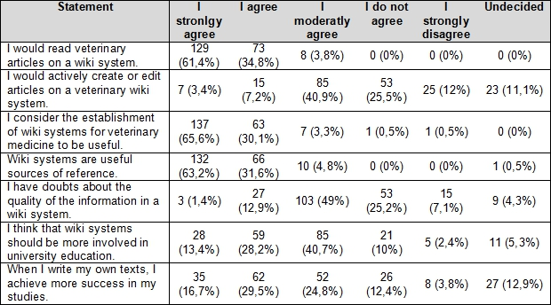 Table 2: Responses from students from the 1st, 3rd and 7th Semester on the use of veterinary wiki systems (n=210)