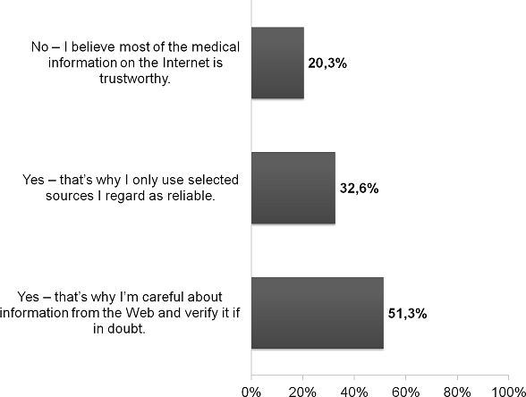 One worry for university teachers considering the use of Web 2.0 in medical training concerns the validity of the information found in various online sources. Different studies (e.g. by Wikipedia) have failed to provide a uniform picture. However, a survey conducted among students in the Faculty of Medicine at Universität Leipzig revealed that students are well aware of this problem and only a small proportion of users trust the information they find unquestioningly (see Figure 6 [Fig. 6]).