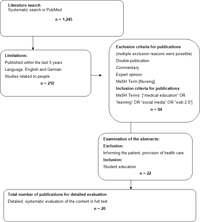 A systematic literature review based on the research question was conducted on 1 May 2012, using PubMed. In the search query: 16 terms (MeSH) related to the term “medical”, 43 terms (MeSH) related to the term “education” and 51 terms (MeSH) related to the term “social media” were used. By connecting these terms, 1245 results were obtained. This was reduced to 84 results after applying the limiting factors and the appropriate inclusion and exclusion criteria (see Figure 1 [Fig. 1]). One limiting factor was a publication date range that included the last five years, which, due to the rapid development in this area, was used to further restrict results. In the subsequent examination of the abstracts, articles dealing with health care provision, and educating and informing the patient were excluded. The remaining publications were evaluated in their full-text form. At this point, two additional articles were excluded. One was related to training librarians, and the other was about the Greek post-secondary education system. Therefore, 20 articles were examined in detail.