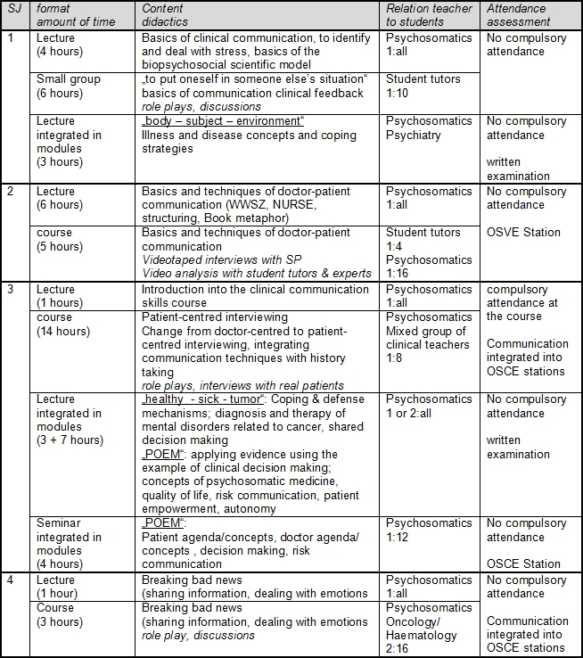 Background: Within the Bologna reform, a longitudinal curriculum of “social and communicative competencies” (SOKO) was implemented into the new Bachelor-Master structure of undergraduate medical education in Basel (Switzerland).