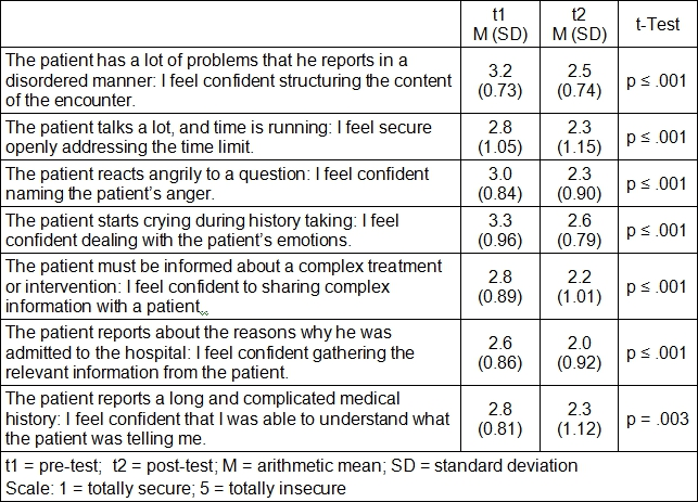 Table 2: Evaluation of the communication skills course in the Bachelor year 3: pre-post testing about self-perceived secureness in dealing with specific encounters