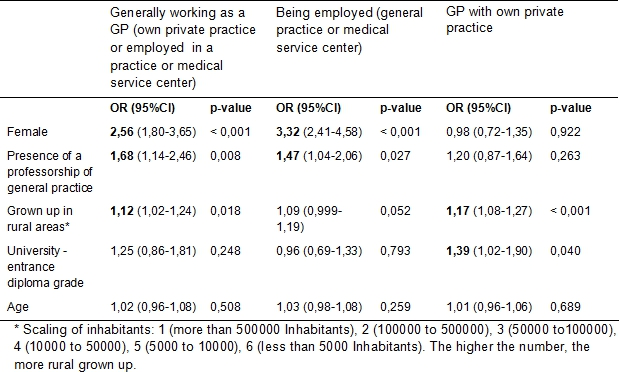 Results: 940 (15.2%) out of 6182 medical students from three Bavarian medical faculties participated in an online survey. 585 (62.7%) were female, and the average age was 25.0 (standard deviation 3.7). The average grade of a university-entrance diploma was 1.6 (standard deviation 0.5). 718 (76.4%) could imagine working as a GP. However, they favoured being employed within another organisation and not having their own private practice (65.5% vs. 35.1%). “Presence of a professorship of general practice” was associated with a positive attitude towards general practice (OR 1.57; 95%CI 1.13-2.417). Motivation for working as a GP was associated with “being female” (OR 2.56; 95%CI 1.80-3.56) and “presence of a professorship of general practice” (OR 1.68; 95%CI 1.14-2.46). Having a lower grade for one’s university-entrance diploma was associated with a higher preference to work in one’s own practice (OR 1.39; 95%CI 1.02-1.90).