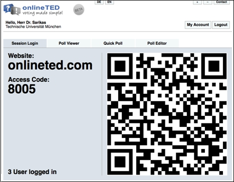 In contrast, "OnlineTED" is a web-based AR system that utilizes internet-enabled end devices of the audience as handsets. "OnlineTED" does not require the installation of software, is fully web-based and thus can be used on any operating system. Each poll question requires a bi-directional data transfer of approximately 0.03 Mbit, which enables the participation of large audiences even with low data bandwidth. The operative range of "OnlineTED" is not spatially limited and thus can be used for distance teaching, e.g. webinars. Sets of multiple-choice questions can be created and manage in "OnlineTED", and spontaneous polls with different rating scales (yes / no / undecided; very low - very high; excellent - insufficient; strongly agree - strongly disagree) conducted as "quick polls" options.