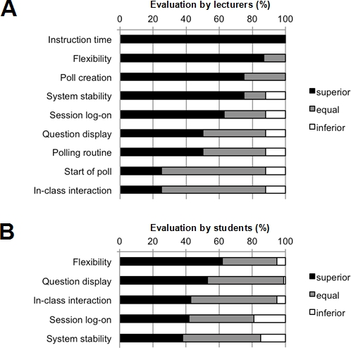Figure 4: Comparison of “OnlineTED” with a conventional AR system using clickers. A. Evaluation results by lecturers. B. Evaluation results by undergraduate medical students at TUM. The response rate was 8 of 10 and 361 of 709 (51%), respectively. The stacked bars depict the relationship of individual items to the whole in percent.