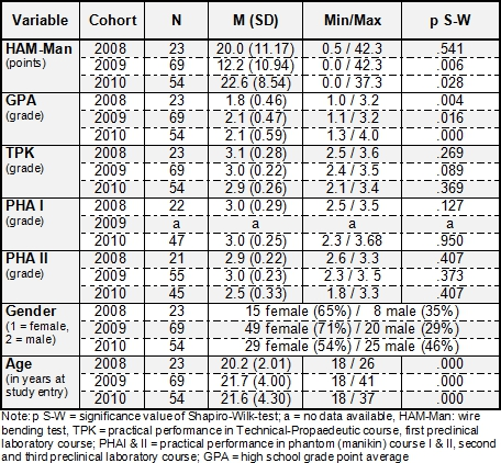 Due to dropout the number of participants in PHA I and PHA II are lower than in the TPK (see table 1 [Tab. 1]). Of particular note were the significant HAM-Man score differences between the cohorts (F=15.3; p<.001). The 2009 cohort showed significantly lower HAM-Man scores than the 2008 (p<.05) and the 2010 (p<.001) cohort, but there was no significant difference between the 2008 and the 2010 cohort. Therefore, we decided to perform separate analyses for each cohort.