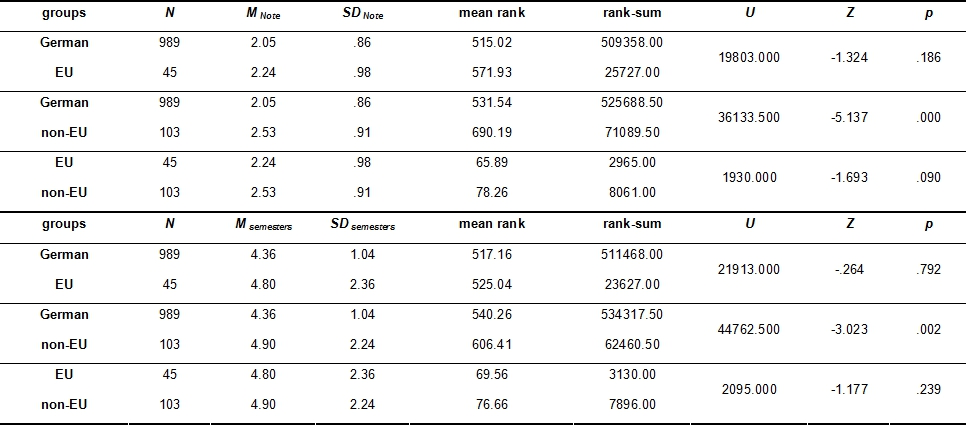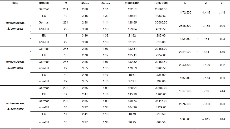 Table 2: Mann-Whitney-U-Test for marks in written exams in German, EU- and non-EU-students