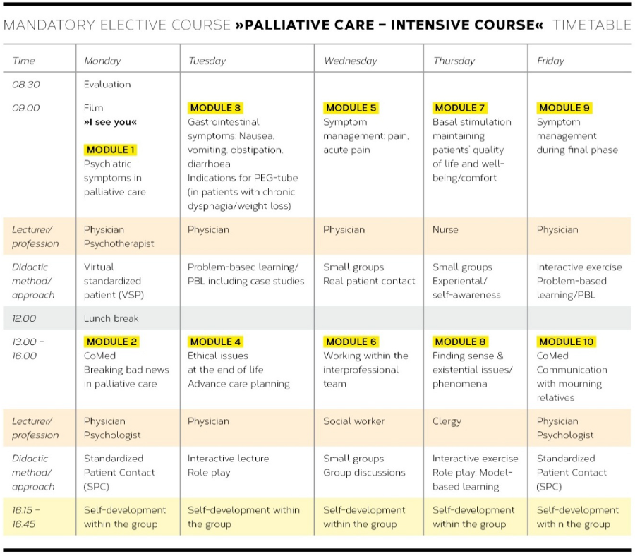 Figure 3: Timetable of mandatory elective course „Palliative Care – Intensive Course“ including teaching strategies