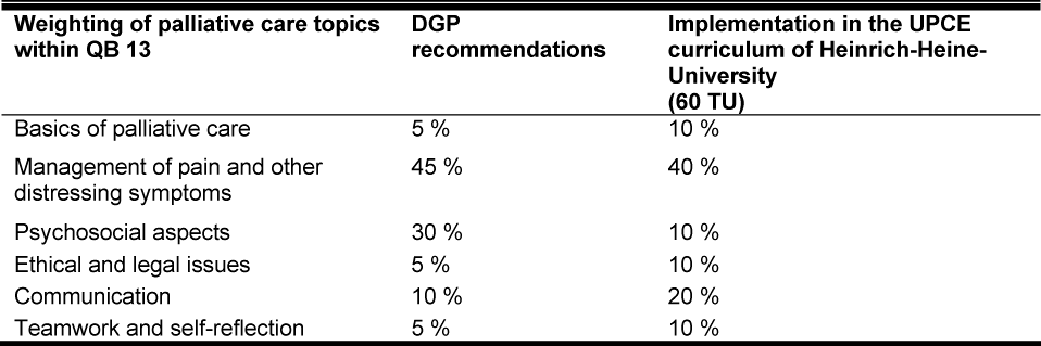 Table 1: Weighting of palliative care topics within QB13 as recommended by the German Society for Palliative Care (DGP) and its implementation in the UPCE curriculum of Heinrich-Heine-University