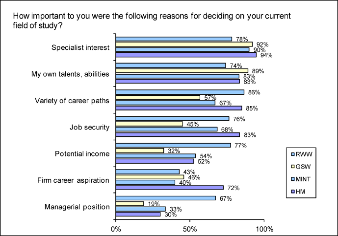 Figure 3: Responses to the question “How important to you were the following reasons for deciding on your current field of study?” (Proportion of scores 4-6 on a scale going from 0= “totally unimportant” to 6= “very important”)