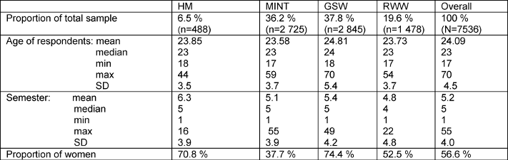 The sociodemographic characteristics of the participants in the four subject groups are presented in the supplement (see Table 1 [Tab. 1]). It was no surprise that a higher semester is mentioned on average in human medicine because of the comparatively long standard period of study. The highest proportion of women was found in GSW and HM. The percentage distribution of subject groups in the student survey deviates only slightly from the student population in the same year (see Table 2 [Tab. 2], see [21]). In all subject groups, a higher percentage of women responded than would have been expected in relation to the population (HM +9.5% points, Ø +8.8% points).