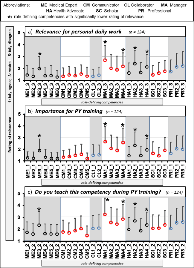 Methods: 124 physicians from internal medicine and surgery rated the relevance of the 28 key competencies of the CanMEDS framework using a questionnaire. For each competency, following three aspects were rated: “relevance for your personal daily work”, “importance for teaching during PY”, and “implementation into actual PY teaching”.