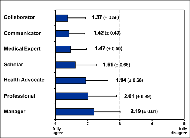 As already said, some of the key competencies were rated to be less important (related to the roles “Medical Expert”, “Manager”, and “Health Advocate”). These competencies address the topics interprofessional communication, basic societal conditions, leadership skills, and preventive medicine. These fields are less central to the individual patient-physician-relationship and therefore might be perceived as less important in the eyes of clinically active physicians. As an interesting point the explicitly interprofessional key competencies (under “Collaborator”) were rated to be more relevant than the key competency “ME3” (Seek appropriate consultation from other health professionals, …) under “Medical Expert”. An explanation may be that the competency “ME3” was rated in comparison to the other key competencies of the “Medical Expert”, while competencies under the “Collaborator” role were clearly limited to collaboration.