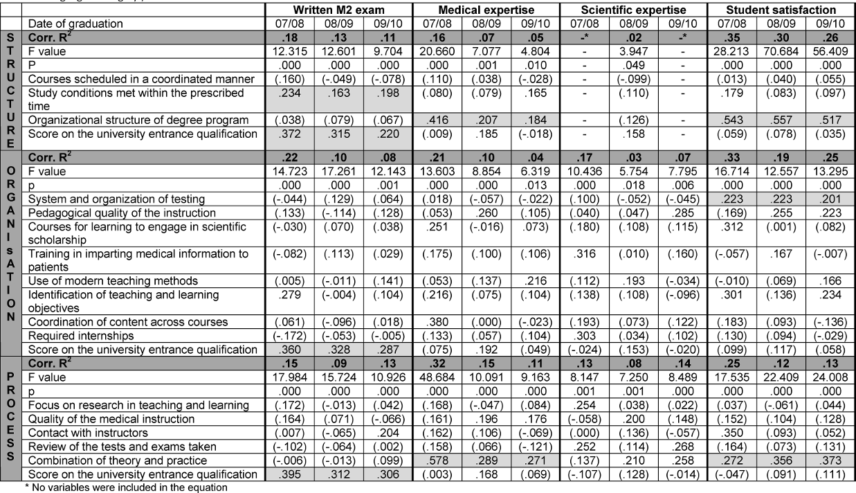 Results: It was possible to identify models that contribute slightly or moderately to the prediction of study success. The score earned on the university entrance qualification demonstrated itself to be the strongest predictor for forecasting the M2 written exam: R2 is between 0.08 and 0.22 for the three surveys. Different variables specific to degree program structure and teaching are helpful for predicting medical expertise (R2=0.04-0.32) and student satisfaction (R2=0.12-0.35). The two variables, structure and curricular sequencing of the degree program and combination of theory and practice, show themselves to be significant, sample-invariant predictors (β-weightStructure=0.21-0.58, β-weightCombination=0.27-0.56). For scientific expertise, no sample-independent predictors could be determined.
