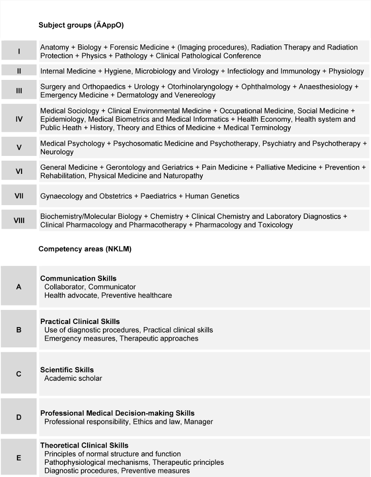 Both the current German medical licensing regulations (ÄAppO) [http://www.gesetze-im-internet.de/_appro_2002/BJNR240500002.html, last verified on 14 December 2014] and the NKLM were drawn upon to design the blueprint. The goal was to incorporate the 55 subjects listed in the ÄAppO and the 17 relevant areas of the NKLM (sections I and II) in a two-dimensional blueprint for a written assessment. To make the blueprint feasible for compiling an examination, the number of cells must be limited, for which the subjects and the NKLM areas were put into groups. As part of the ItemManagementSystem (IMS) conference in January 2013, three inter-university and interdisciplinary expert groups were formed and, as a first step, each given the task of independently placing the NKLM areas into clusters of competency areas. In a second step, the expert groups were assigned the task of building clusters of subjects based on those listed in the ÄAppO in such a way that each cluster contained pre-clinical and clinical subjects in as equal a measure as possible.