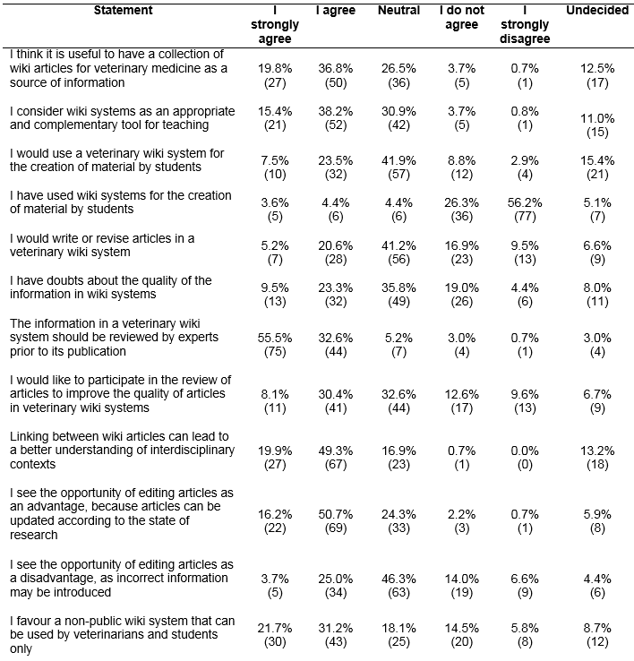 The majority of lecturers regarded it useful to have a collection of wiki articles for veterinary medicine as a source of information (56.6%). The lecturers considered wiki systems as an appropriate and complementary tool for teaching (53.6%).