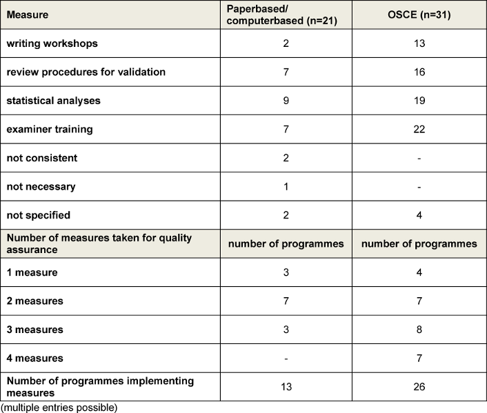 The answers to the questions regarding assessment quality assurance were also notably varied. This applies particularly to examiner training, above all for the most frequently employed assessment format, OSCE. The formulation of recommendations on the basis of evidence would be a desirable development.