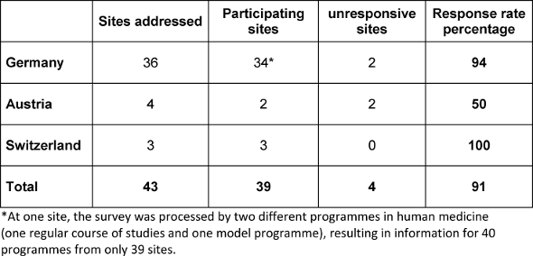 Thirty-nine of the 43 sites approached (medical faculties/universities/colleges) participated in the survey. This number represents a 91% return (see Table 2 [Tab. 2]). At one site, the survey was processed by two different programmes in human medicine (one regular course of studies and on model programme), resulting in information for 40 programmes from only 39 sites.