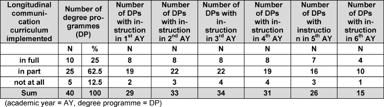 At the time of the survey, communicative competencies were being taught in all of the participating degree programmes. Ten of the 40 degree programmes indicated that all of their courses in communicative competencies were coordinated in accordance with a longitudinal curriculum. A longitudinal curriculum existed in part or had just been implemented in 25 degree programmes, while five programmes reported having no longitudinal curriculum (see Table 3 [Tab. 3]).