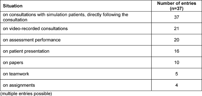 Teaching staff provided the feedback in all 37 programmes in which it was implemented. Additional feedback came from fellow students in 35 programmes and from SPs in 31 programmes. Real patients were rarely (n=4) named as sources of feedback. None of the programmes indicated nursing staff as sources of feedback. The situations on which feedback was given are detailed in Table 6 [Tab. 6].