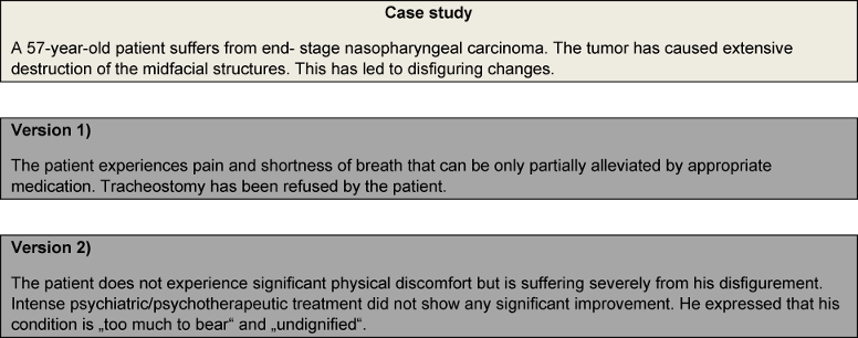 The fictitious case vignette study, in which a patient suffers from a nasopharyngeal carcinoma, was presented in two versions (see figure 1 [Fig. 1]). The questionnaire with either version 1 or version 2 was randomly distributed among the students. According to version 1, the patient mainly suffers from untreatable physical symptoms (shortness of breath, pain). In version 2, the patient does not experience any significant physical discomfort, but an insufficiently treatable emotional, existential affliction that is a result of the illness. Each version of the case study subsequently presents three scenarios: