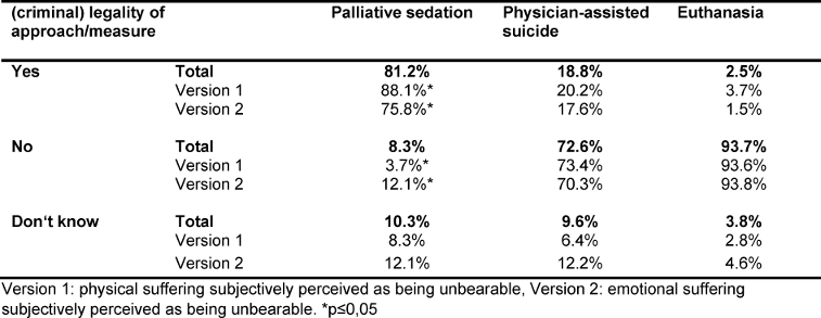 There was no significant difference between versions 1 and 2 regarding the ethical acceptability of the three treatment options (palliative sedation, physician-assisted suicide, euthanasia) (see table 2 [Tab. 2]). The administration of palliative sedation was only slightly more frequently supported in the case of emotional suffering than in the case of physical suffering (88% vs. 80.3%).