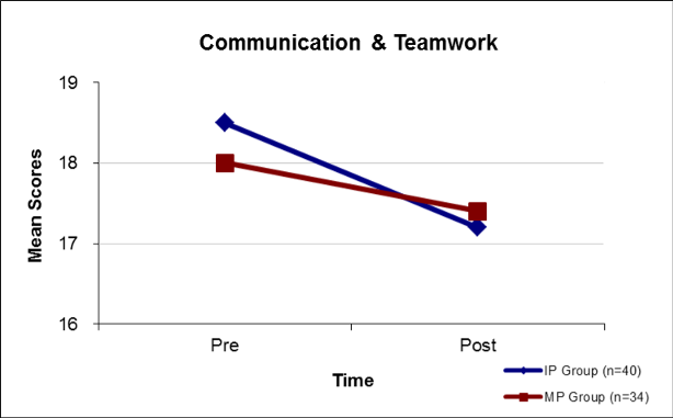 Figure 1: Attitudes to “Communication & Teamwork” (MP Group versus IP Group). Communication & Teamwork Scale: 9 items; 5-point Likert scale; Sum score range: 9 most positive to 36 most negative