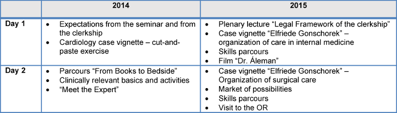 Table 1: Course organization of "Ready for the Clerkship" 2014 (pilot project) and 2015