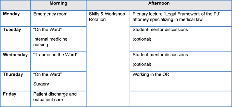 The first part of each module concentrates on thematically organized basic aspects of a medical case description in clinical care starting as an internal case and then transferred into a surgical one. In the concluding segment of the respective module, basic concepts of clinical skills needed for patient care on the ward are taught. The aim of the course is the consolidation of the role of the medical clerk as a participating observer of clinical practice with the aim of strengthening medical skills.