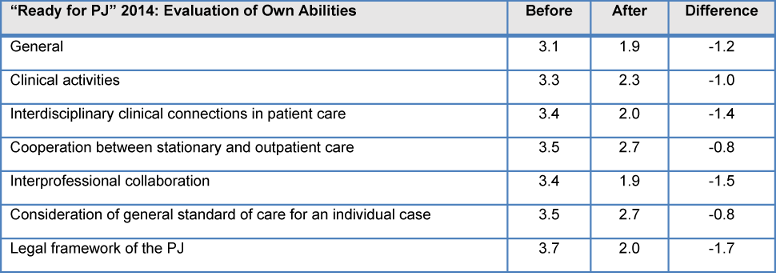 The analysis of needs assessment carried out prior to the course regarding preparation for the PJ and subjective evaluation of their own abilities showed only “satisfactory” results for the students; the results of the evaluation of the seminar documented a marked improvement in self-evaluation (see Table 4 [Tab. 4]).