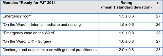 The evaluation by the medical students demonstrated that the “Ready for PJ” course was an excellent preparation for the internship with an average rating of 1.65 (2014) and 1.7 (2015). Participants regarded the course as being relevant for the ensuing tasks during the internship and in general would recommend it to other students. In 2014 93percent agreed that the discussions were constructive and that the knowledge acquired could be applied during the internship. This was also evaluated positively in 2015 with 76 percent agreeing.