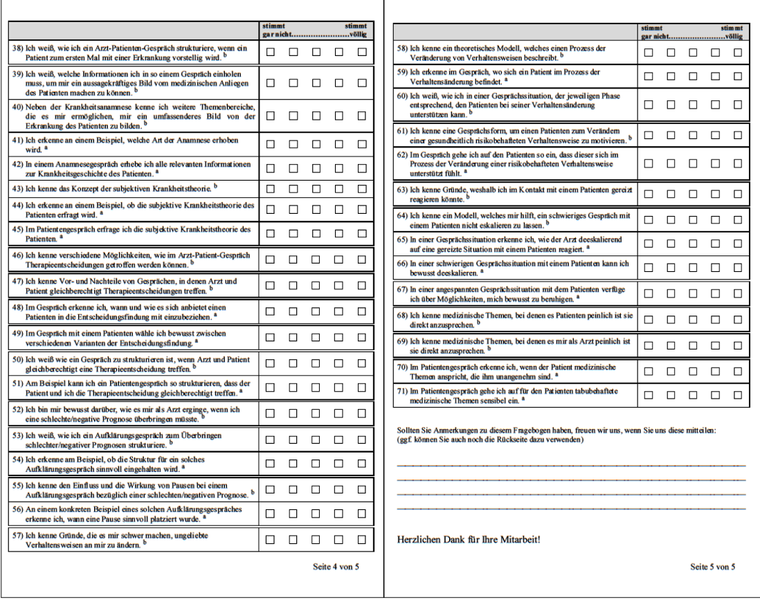 The course finishes after the second course semester with a video-based exam, that tests to what extent the students’ can apply what they have learned to a practical example. In addition, the training course is evaluated by the students at the end of each course semester. However, neither the exam nor the students’ feedback provide any information on the knowledge and abilities the students already had before starting the course and which competencies have been acquired through active participation in the course. Furthermore, nothing can be said, as to how the students themselves assess the impact the course has on their communication skills.