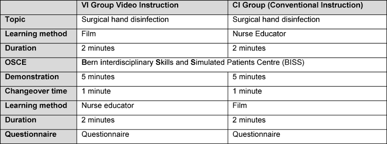 In this non-inferiority study we investigated which method a (VI=video instruction) or b (CI=conventional instruction) had the better effect for learning surgical hand disinfection among first-year medical students at the University of Bern. Based on the literature mentioned in the introduction, we expect that the students will demonstrate at least an equivalent or better performance after the video instruction (VI) than the students from the conventional instruction (CI).