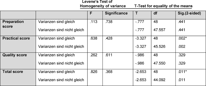 In the T-test (see Table 4 [Tab. 4]) a significant influence of the video instruction on the practical is demonstrated (p=0.002) and in the total score (p=0.011).