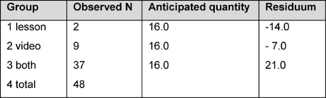 In response to the question as to which of the interventions they would prefer, 29 (60.4%) answered in favour of the video and 19 (39.6%) in favour of the lesson. Therefore, five students from the conventional instruction group decided on the video having watched the video (see Table 6 [Tab. 6]).