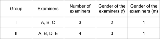 The difference in the respective group sizes (I versus II) resulted from the actual size of the semester which was subject to large variations and which was dependent upon the results of the preceding examination. A numerical adjustment of both groups was not feasible as all course participants, according to the study regulations, had to take the exam. The determination of the number of examiners was carried out prior to this study on application for ethical approval. The assignment of identical examiners for both groups was not practical for staffing reasons in the department.
