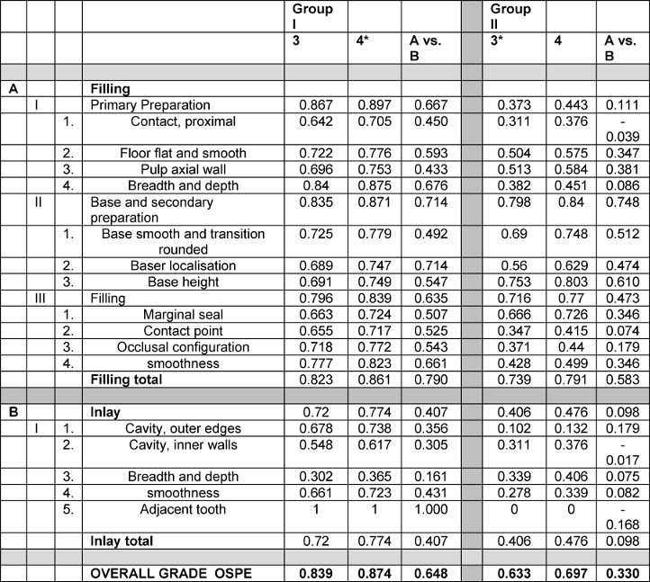 In group II the results for 4 examiners showed a high variance in the calculated Cronbach’s alpha values. For the first subunit “primary preparation” and the accompanying criteria (“proximal contact point” to “breadth/depth), Cronbach’s alpha values under 0.6 were calculated. The same was the case for the subunit “filling” and the accompanying criteria “contact points”, “occlusal design” and “smoothness”, for “inlay total” and accompanying criteria such as “cavity outer edge”, “cavity inner walls”, “breadth/depth”, “smoothness” and “adjacent tooth”. The remaining subunits and criteria were able to achieve the required value for sufficient reliability of 0.6.