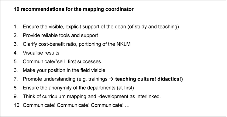 Without a differentiated overview of the existing overall curriculum, the risk when integrating so-called core curricula increases significantly, that decentralized curricula evolve resp. are reinforced [2]. Although, many learning objectives are dealt with in such curricula, specialised knowledge and competencies are distributed over many semesters and courses, without mutual correlation and often without testing [2]. Curriculum mapping is considered a suitable method of gaining transparency in the curriculum [2], [8], [18], [21], [24]. For faculties planning curriculum mapping, the findings presented here may provide some assistance. The analysis of the change process at the four locations consistently revealed a series of factors, where causal relation with successful progression of the project appears plausible [1], [6], [11], [12]. From the overall consideration of the findings, ten recommendation for coordinators can be derived (see table 1 [Tab. 1]).
