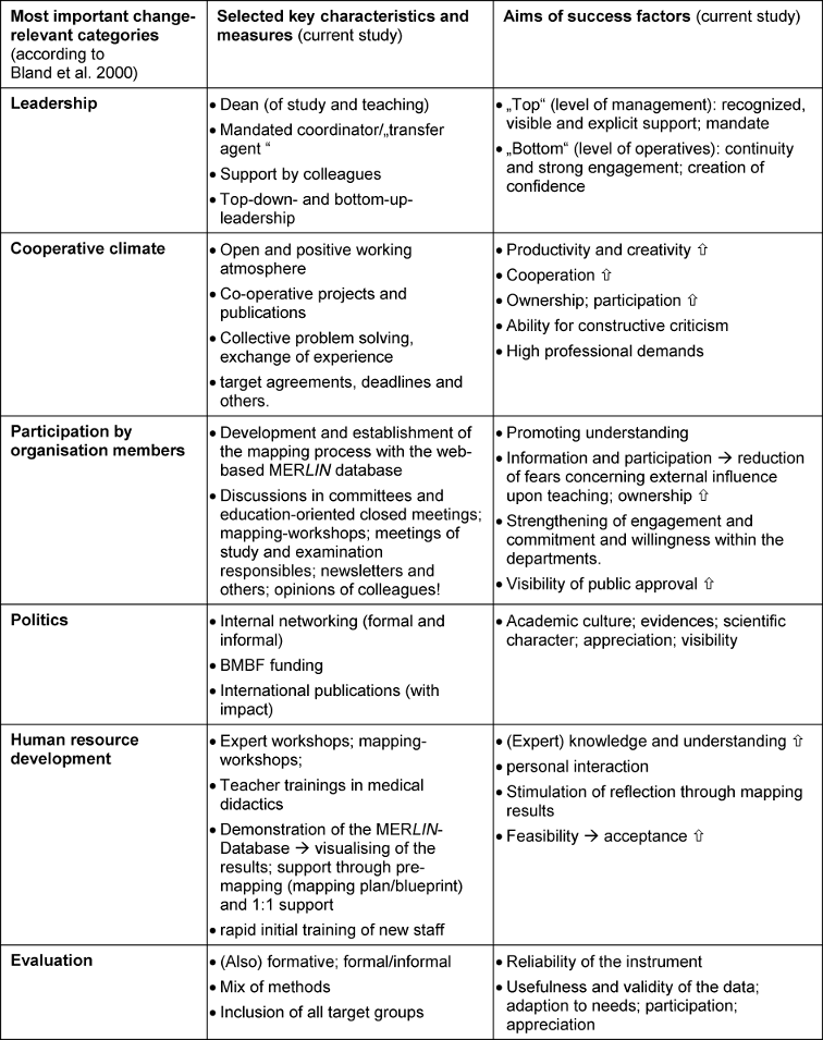 Table 2: Tabular overview of the most important factors within the change process in curriculum mapping in comparison to the most important change-relevant categories to Bland et al. 2000. The conducive resources and structures that should be installed at the beginning of the project are discussed in Part I of this article; all factors and measures supporting and accompanying the process are explained in Part II.