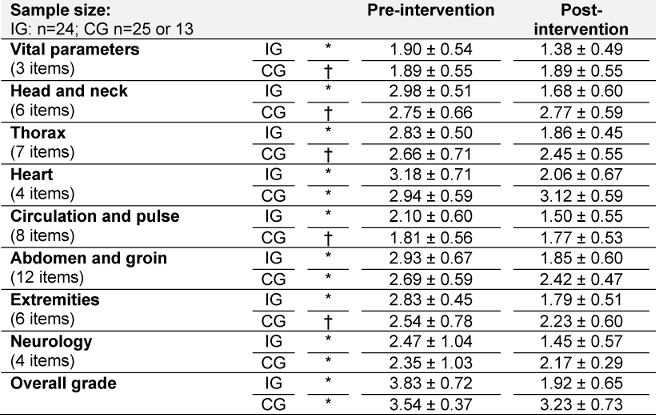 Table 1: Self-assessment of examination skills using a six-point Likert scale in line with the German grading system (1: very good; 6: fail). The table shows the average score (±standard deviation; *significant or † not significant in the pre-post comparison) of the students in the intervention (IG; n=24) and control groups (CG; n=25; analyzable: 13).