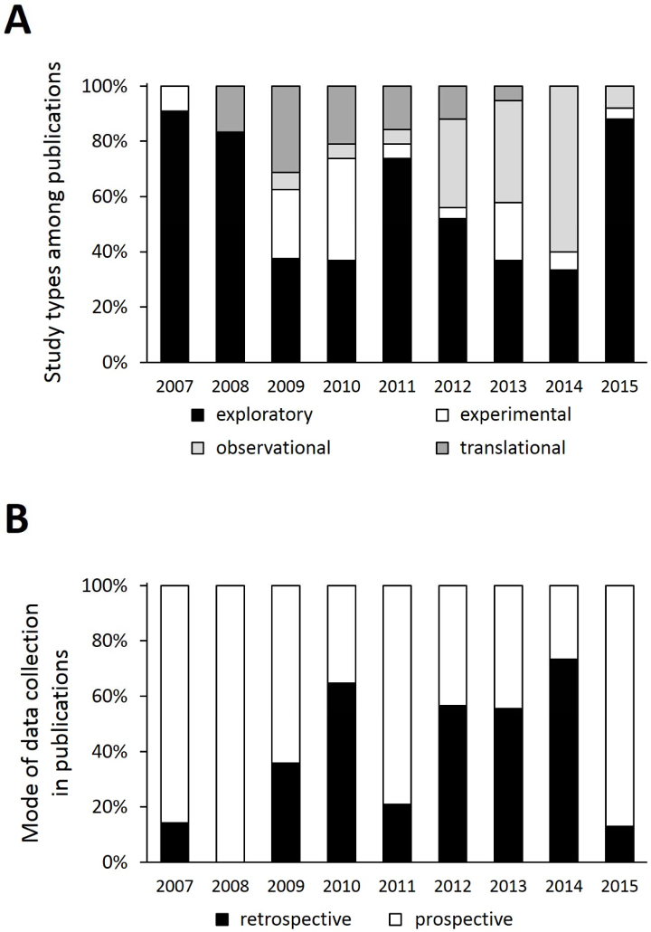 Figure 4: Study type (A) and mode of data collection (B) in scientific papers published in GMS Z Med Ausbild from 2007 to 2015.