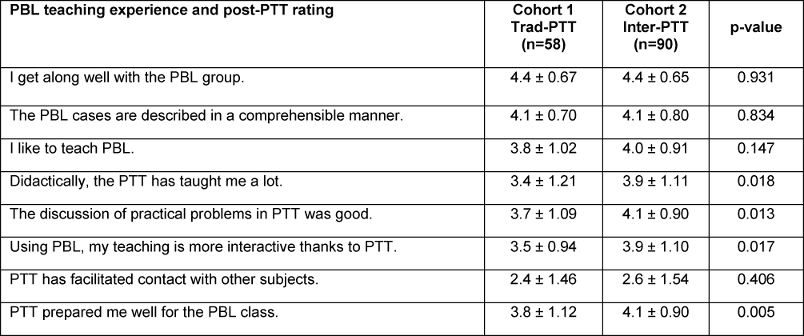 Most strategies to mediate PBL successfully focus on group dynamics and promote critical thinking [12]. Since the process of learning support depends on the tutor’s approach, he should be critically recapitulated on a regular basis [24], since teacher training is an important prerequisite for good teaching. The share of PTT graduates with no teacher experience rose from 12.9% (cohort 1) to 21.6% (cohort 2) signalling that more young employees were sent to PTT. Self-commitment could also have forced departments to invest more in the long term. The PBL tutors knew that they would be used for PBL in the successive semester, which might have increased the concentration during training.
