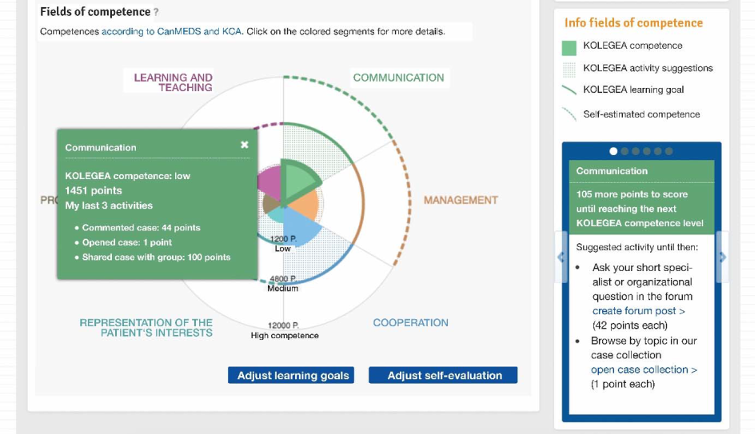 On the platform, gamification is combined with CanMEDS competencies, which are central to many international PT in GP programs. Each user can see the activities they performed on the platform on their personal "activity monitor", which visualizes the online activity on the platform as an online learning progress relating to the development of each area of medical expertise and the CanMEDS competencies. On the KOLEGEA platform this learning progress in the user’s level of expertise is visualized by the color coding (see Figure 3 [Fig. 3]). The activity monitor is a tool for users to individually adjust and angle their activity on KOLEGEA to best suit their further PT learning objectives. It must be noted that the user’s self-assessment and the activities conducted online represent only a simple estimate of the user’s expertise on a particular competence, and this has to be distinguished from actual knowledge and skills in real practice (see Figure 2 [Fig. 2]).