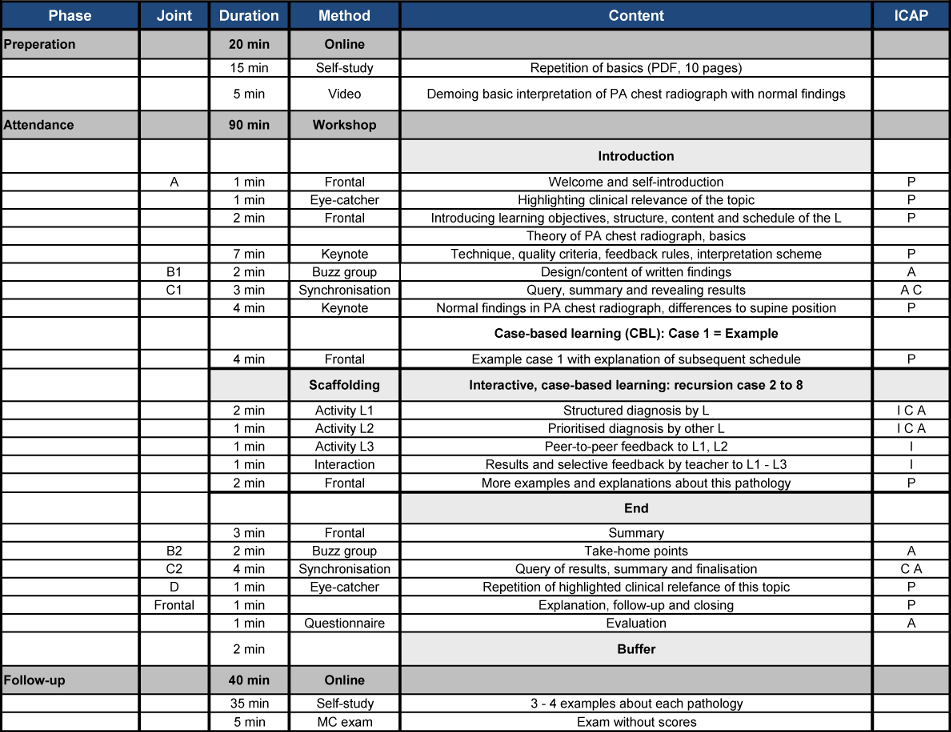 The KERN model [20] for the development of medical curricula was used and the World Federation for Medical Education (WFME) “Global Standards for Quality Improvement – European Specification” [21] were met. A catalogue of learning objectives was developed and categorised by Knowledge, Skills and Competencies/Attitudes [10], adhering to the requirements given by the ESR. Additionally, the cognitive learning objectives were categorised, using the Revised BLOOM’s Taxonomy [22], and operationalised after MAGER [23]. Psychomotor and affective learning objectives were assigned to CANMEDS roles [24]. Finally, a CLUSTERING [25] of learning objectives into thematic groups, educational methods, and formative and summative evaluations was carried out and quality management (QM) was established to secure the flexibility and continuous improvement intended.