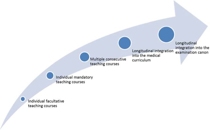 To implement a topic longitudinally, the curriculum has to be developed systematically and strategically orientated [3]. Even though the longitudinal integration of the GMA-LZK in the medical curriculum is the favoured goal, it can be constructive to initially proceed gradually (see Figure 1 [Fig. 1]).