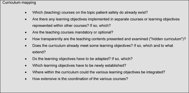 Furthermore, already implemented courses on the topic of patient safety should be incorporated constructively in the overall curriculum to avoid doubling and to ensure that the teaching contents are coordinated appropriately in regard to their levels of difficulty and complexity. The so-called "curriculum mapping", which is used not least to determine a successful curriculum development, is an important aid and offers guidance when developing a curriculum.