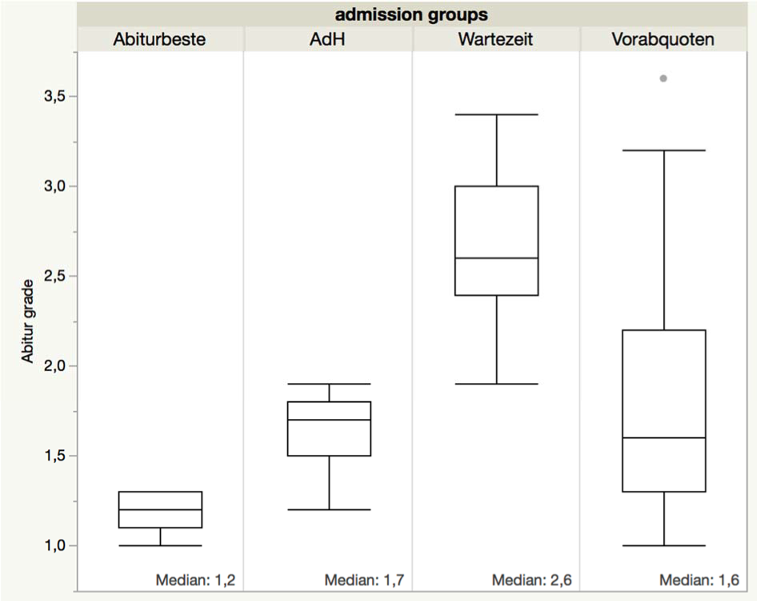 The “Abitur” average grades were distributed as expected among the different admission groups. The “Abiturbeste” achieved better grades than those entering via the “AdH” process, while the “Wartezeit” students had the lowest grades. The grades of “Vorabquoten” students were distributed across the whole range of admission groups (see Figure 1 [Fig. 1]), since this quota was very heterogeneous (non-EU citizens, students from Federal armed forces and personal hardship cases).
