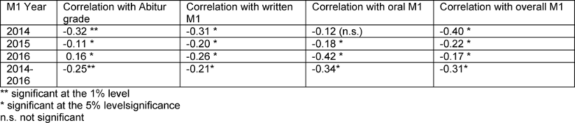 Table 3: Correlation (r) of the Nat score with the Abitur grades and the M1 test results 2014 - 2016