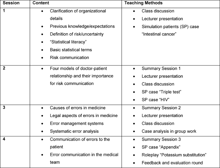 In view of the considerable ethical, legal and communicative requirements in the professional handling of errors and risks as well as the lack of courses offered on these topics for medical students at the Ruhr University Bochum, the authors, for their part expert representatives in medicine, medical ethics, law and linguistics, have co-designed and conducted a series of courses on this issue.